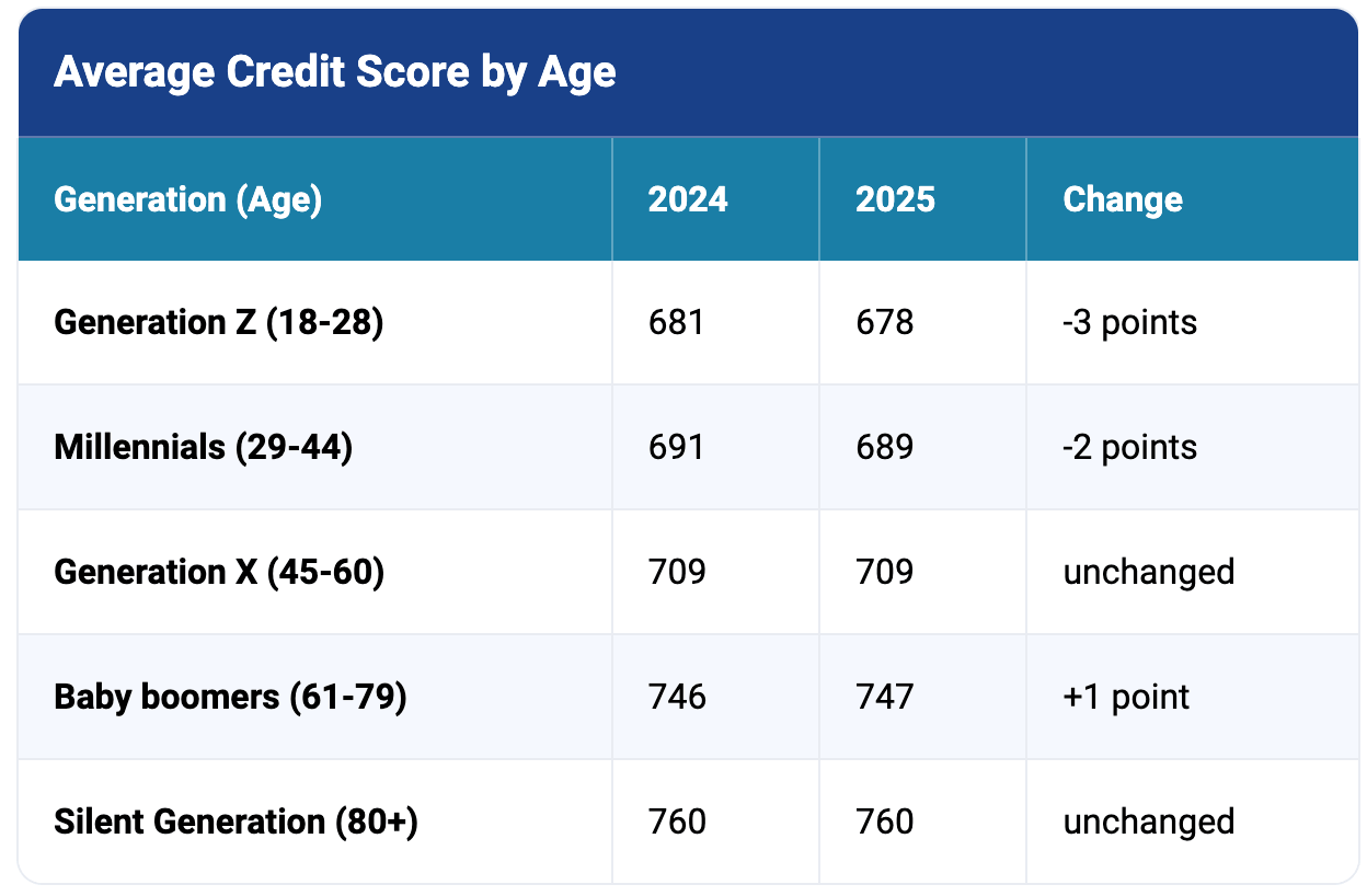 "Younger generations faced the brunt of the credit score declines in 2025. The average FICO® Score for millennials fell two points in 2025. Generation Z's average credit score fell three points.