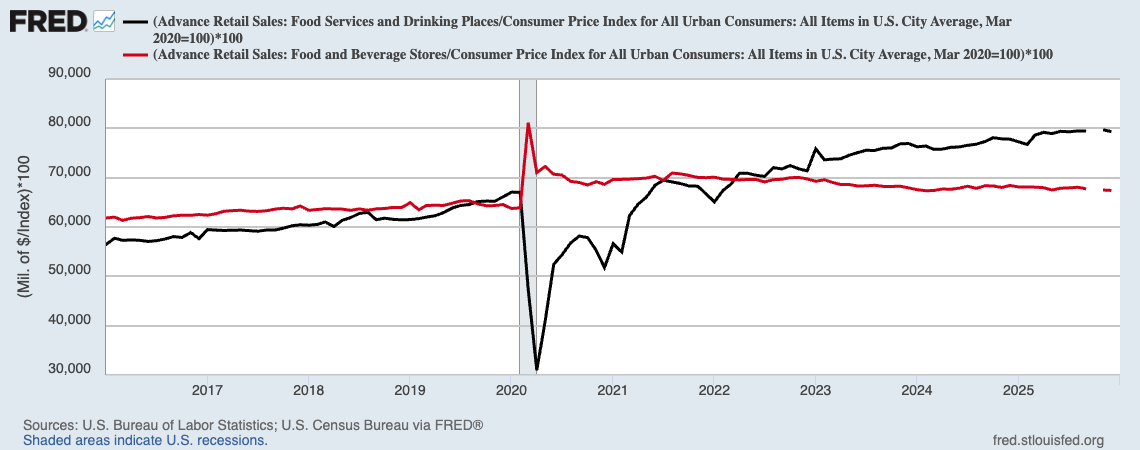 "Over the last two years, US food inflation has diverged. Restaurant and takeout costs climbed faster than grocery prices, which started to level off after sharp increases in 2022. According to the US Consumer Price Index, “food away from home” rose about 6 percent from January 2024 to September 2025, driven by rising labor, rent, and ingredient costs. Meanwhile, “food at home” rose only around 3 percent over the same period. If the gap widens, consumers may perceive there to be less value in dining out relative to the cost of doing so—putting added pressure on restaurants that are already grappling with higher costs and shifting demand."